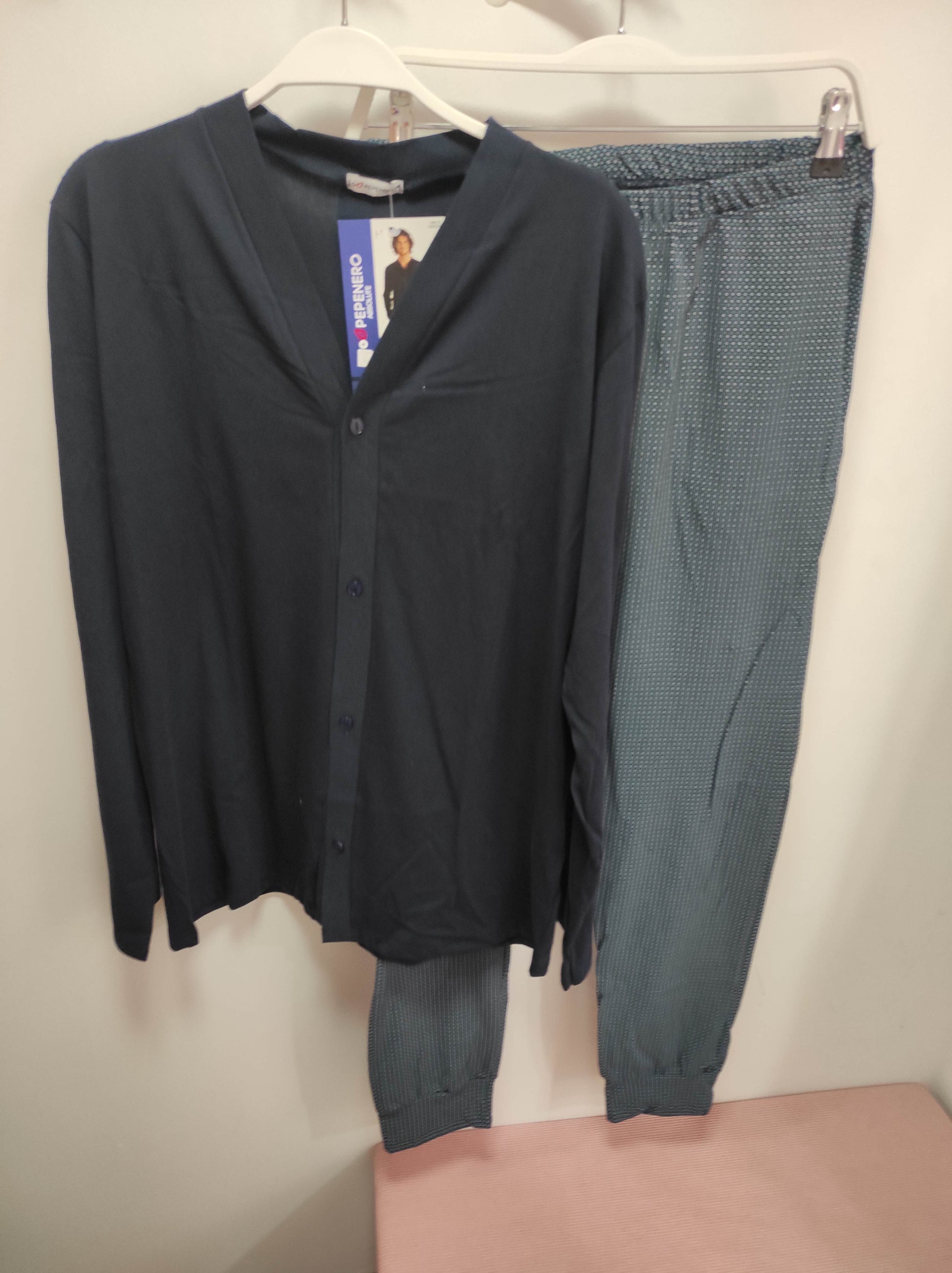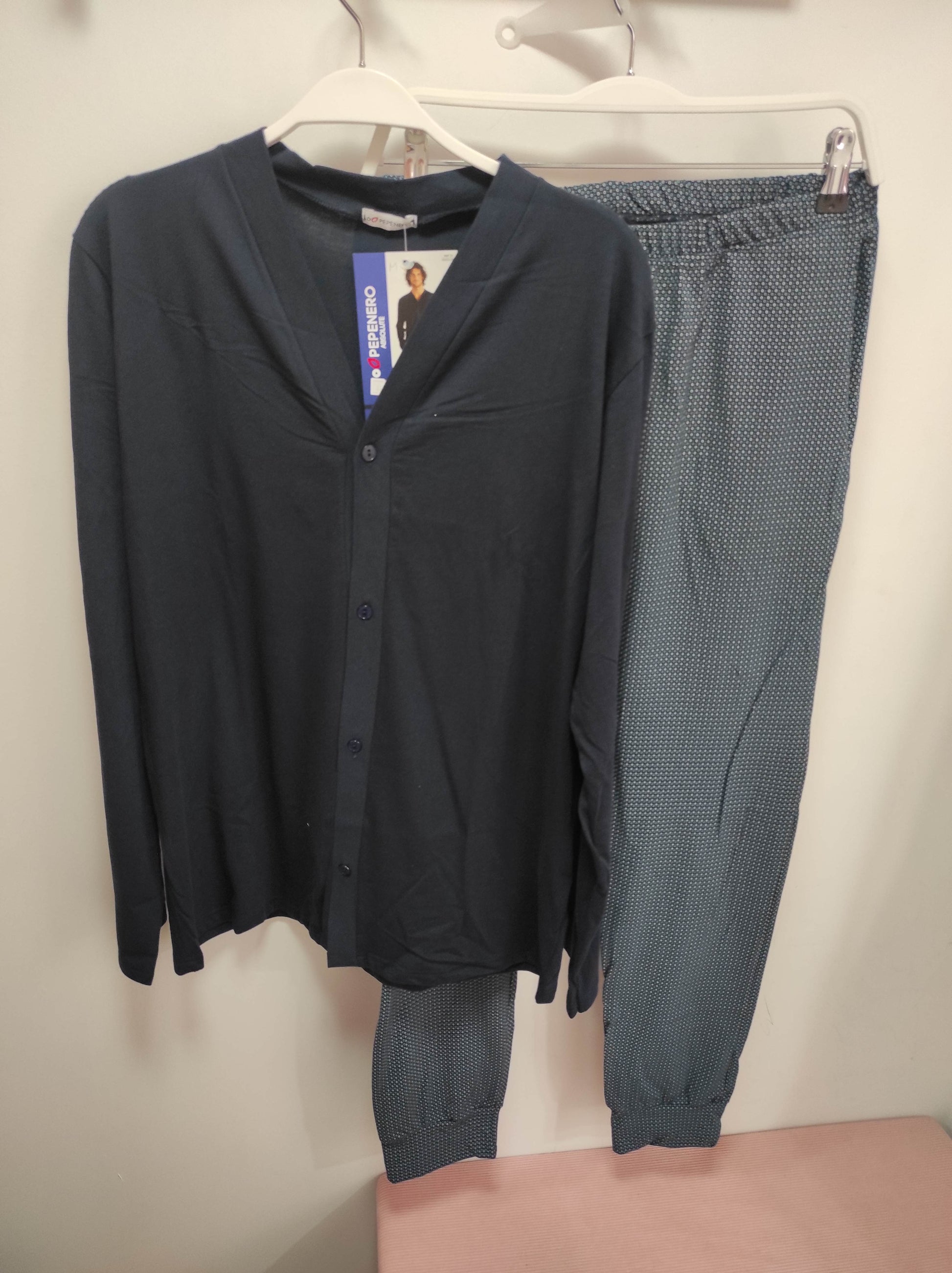 Ανδρικές πιτζάμες με μακρυμάνικη μπλούζα μονόχρωμη navy blue με κουμπιά και μακρύ παντελόνι με λάστιχο στη μέση και στα τελειώματα με ιδιαίτερο πριντ.